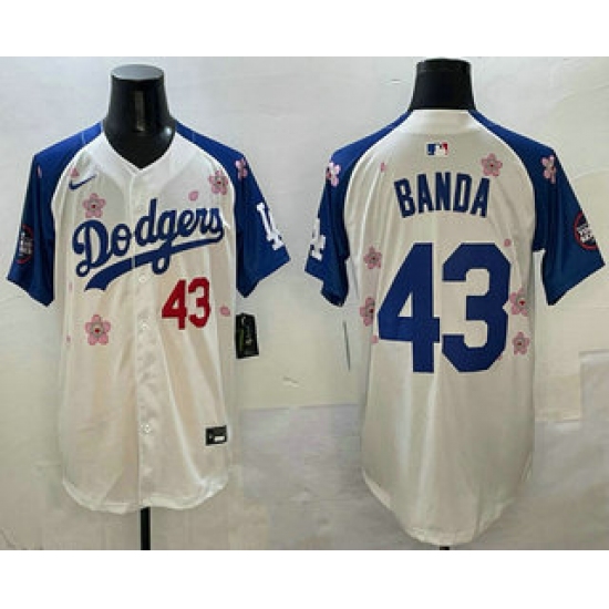 >Men's Los Angeles Dodgers #43 Anthony Banda White Royal 2025 Tokyo Series Limited Stitched Jersey