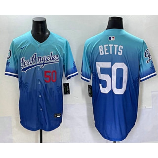 >Men's Los Angeles Dodgers #50 Mookie Betts Blue 2025 City Connect Limited Stitched Jersey