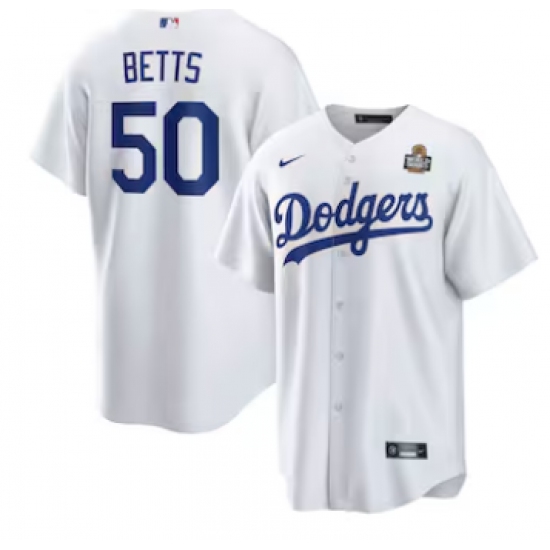 >Men's Los Angeles Dodgers #50 Mookie Betts Nike White 2024 World Series Home Replica Player Jersey
