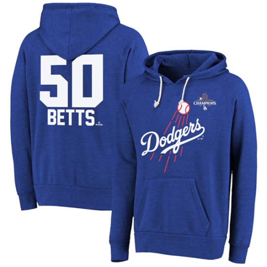>Men's Los Angeles Dodgers #50 Mookie Betts Royal 2024 World Series Champions Name & Number Tri-Blend Pullover Hoodie
