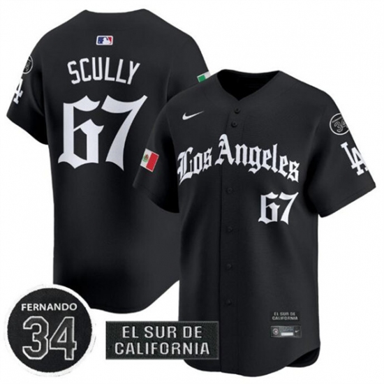 >Men's Los Angeles Dodgers #67 Vin Scully Black Mexico 2025 LA Gothic Style With Fernando Vapor Premier Limited Stitched Baseball Jersey