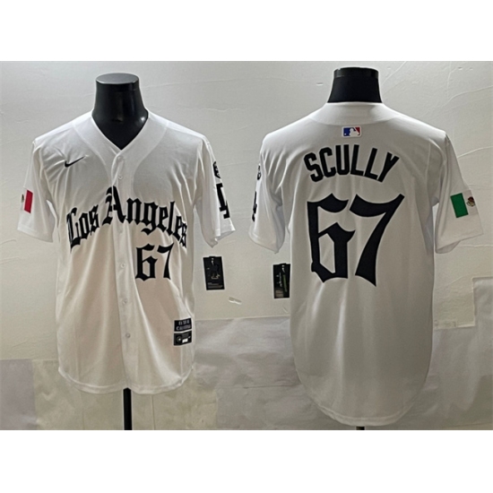 >Men's Los Angeles Dodgers #67 Vin Scully White Mexico 2025 LA Gothic Style With Fernando Vapor Premier Limited Stitched Baseball Jersey