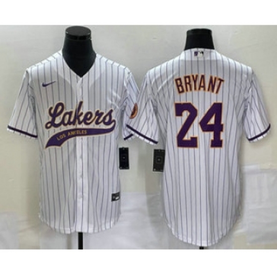 Men's Los Angeles Lakers #24 Kobe Bryant White Pinstripe Cool Base Stitched Baseball Jersey1