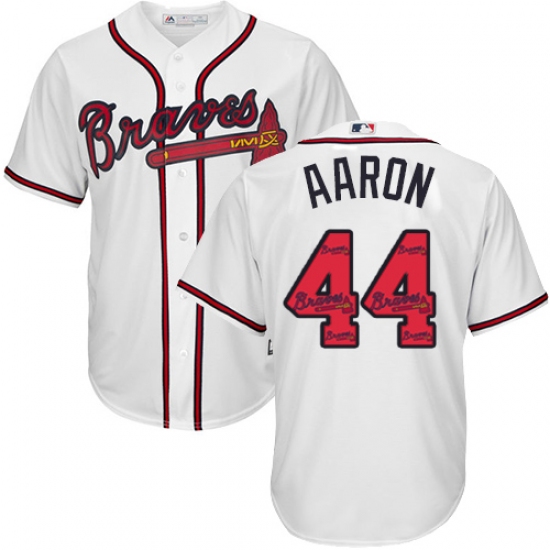 Home>MLB>Atlanta Braves>Hank Aaron>Men's Majestic Atlanta Braves #44 Hank Aaron Authentic White Team Logo Fashion Cool Base MLB Jersey