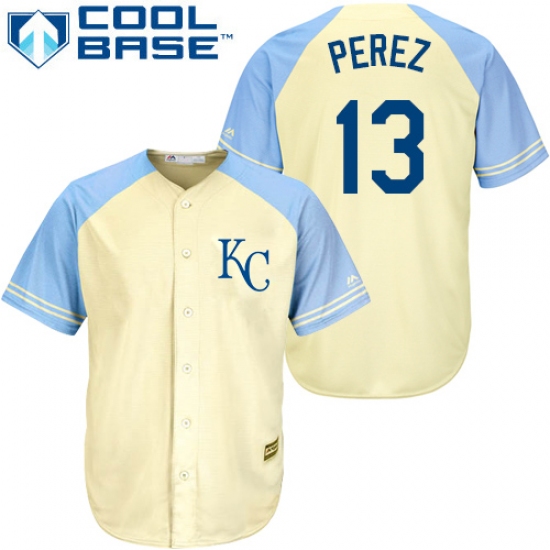 Home>MLB>Kansas City Royals>Salvador Perez>Men's Majestic Kansas City Royals #13 Salvador Perez Authentic Cream Exclusive Vintage Cool Base MLB Jersey