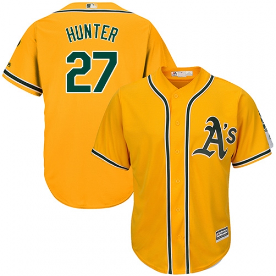 Home>MLB>Oakland Athletics>Catfish Hunter>Men's Majestic Oakland Athletics #27 Catfish Hunter Replica Gold Alternate 2 Cool Base MLB Jersey
