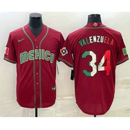 >Men's Mexico Baseball #34 Fernando Valenzuela 2023 Red Blue World Baseball Classic Stitched Jerseys