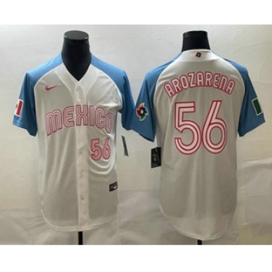 >Mens Mexico Baseball #56 Randy Arozarena Number 2023 White Blue World Classic Stitched Jersey