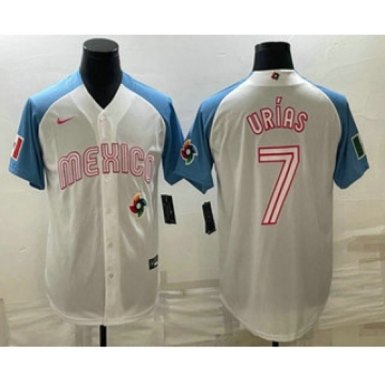 Men's Mexico Baseball #7 Julio Urias 2023 White Blue World Classic Stitched Jersey6