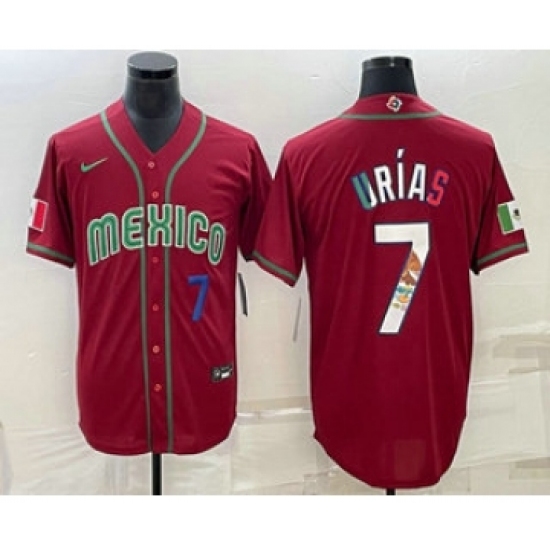 >Men's Mexico Baseball #7 Julio Urias Number 2023 Red Blue World Baseball Classic Stitched Jersey1