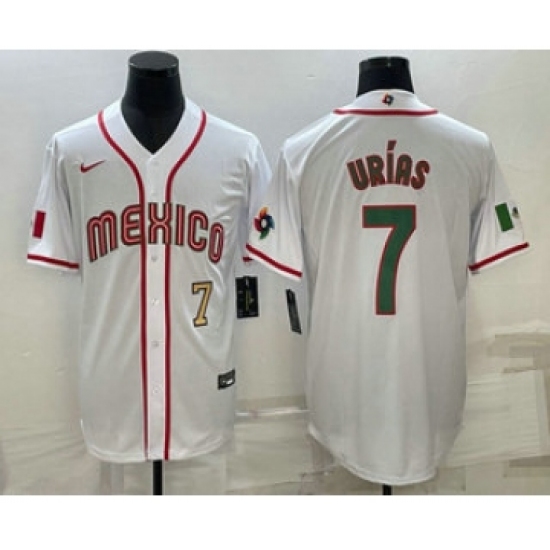 >Men's Mexico Baseball #7 Julio Urias Number 2023 White Blue World Baseball Classic Stitched Jerseys