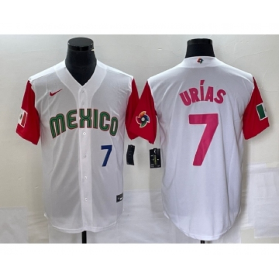 >Men's Mexico Baseball #7 Julio Urias Number 2023 White Red World Classic Stitched Jersey 28