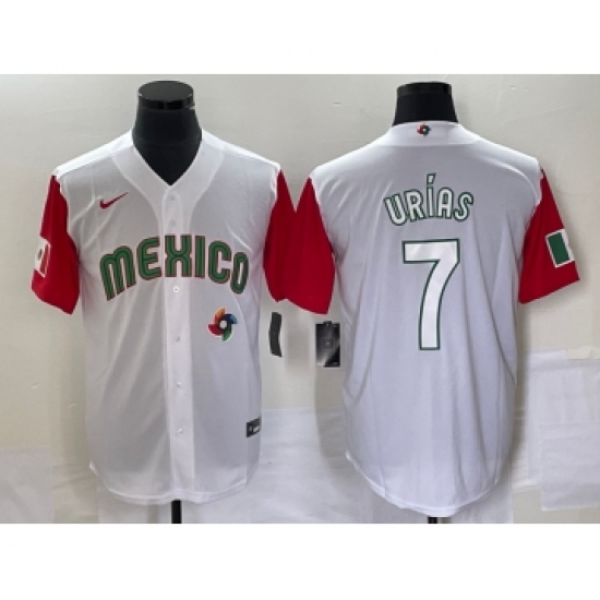 >Men's Mexico Baseball #7 Julio Urias Number 2023 White Red World Classic Stitched Jersey 39