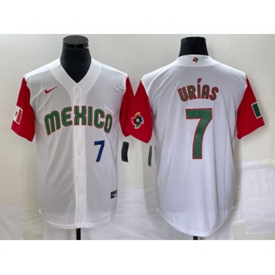 >Men's Mexico Baseball #7 Julio Urias Number 2023 White Red World Classic Stitched Jersey49