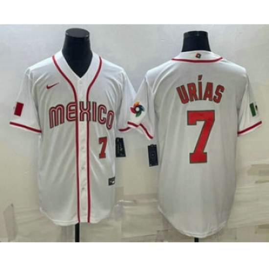 >Men's Mexico Baseball #7 Julio Urias Number 2023 White World Baseball Classic Stitched Jersey2