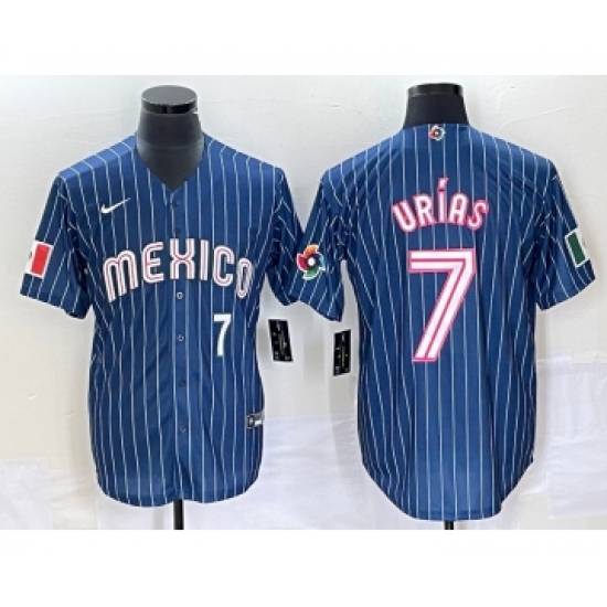 >Men's Mexico Baseball #7 Julio Urias Number Navy Blue Pinstripe 2020 World Series Cool Base Nike Jersey4