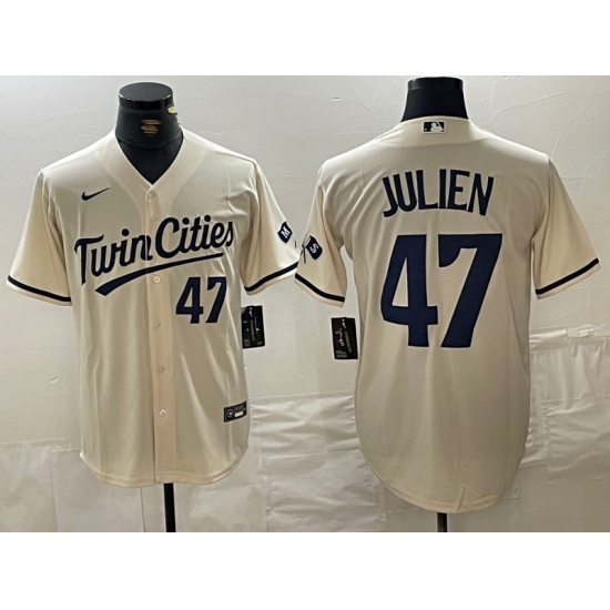 >Men's Minnesota Twins #47 Edouard Julien Number Cream Cool Base Stitched Baseball Jersey
