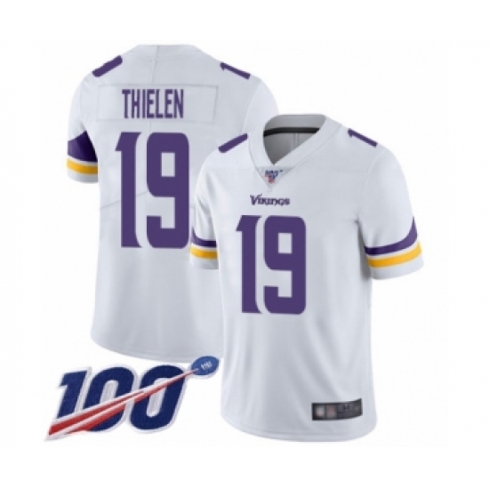 >Men's Minnesota Vikings #19 Adam Thielen White Vapor Untouchable Limited Player 100th Season Football Jersey