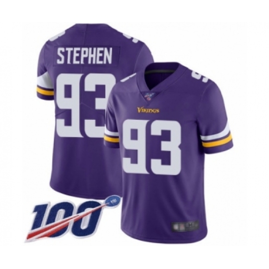Men's Minnesota Vikings #93 Shamar Stephen Purple Team Color Vapor Untouchable Limited Player 100th Season Football Jersey