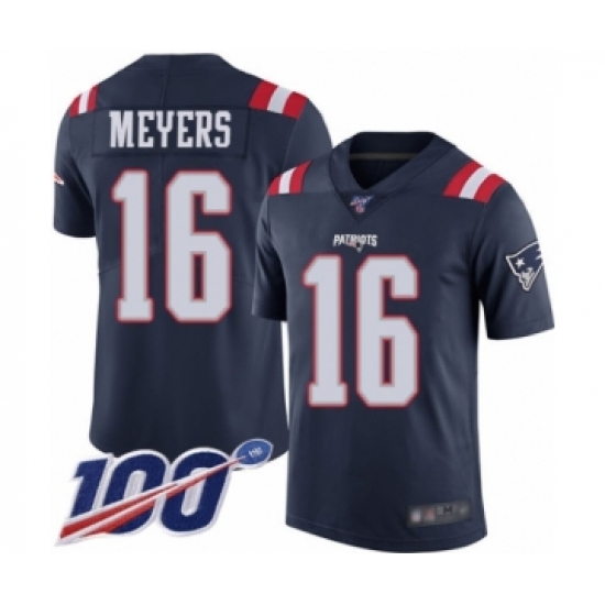 >Men's New England Patriots #16 Jakobi Meyers Limited Navy Blue Rush Vapor Untouchable 100th Season Football Jersey