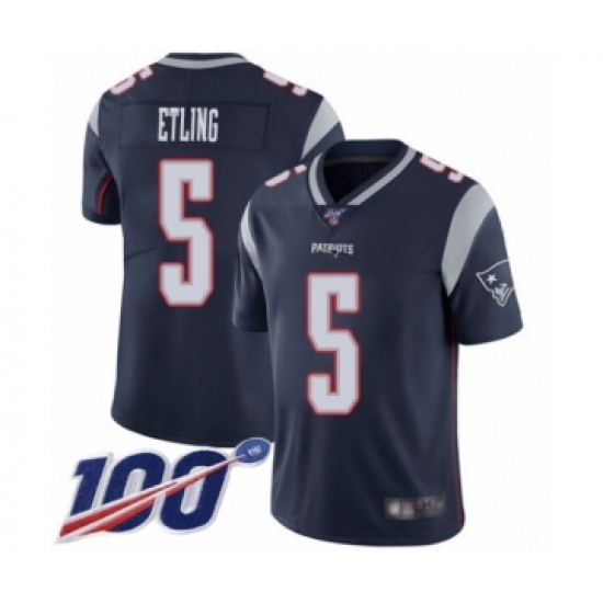 >Men's New England Patriots #5 Danny Etling Navy Blue Team Color Vapor Untouchable Limited Player 100th Season Football Jersey