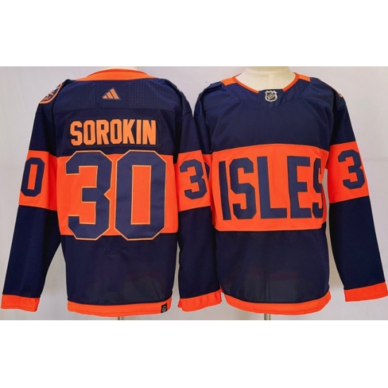 >Men's New York Islanders #30 Ilya Sorokin Navy 2024 With Stadium Series Stitched Jersey