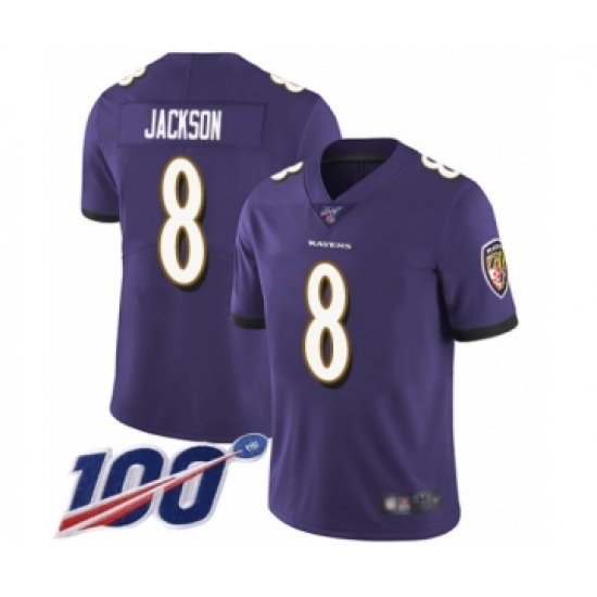Men's Nike Baltimore Ravens #8 Lamar Jackson Purple Team Color Vapor Untouchable Limited Player 100th Season NFL Jersey