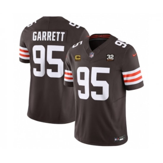 >Men's Nike Cleveland Browns #95 Myles Garrett Brown 2023 F.U.S.E. 4-Star C And Jim Brown Memorial Vapor Untouchable Jersey