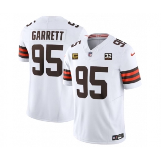 >Men's Nike Cleveland Browns #95 Myles Garrett White 2023 F.U.S.E. 4-Star C And Jim Brown Memorial Vapor Untouchable Jersey