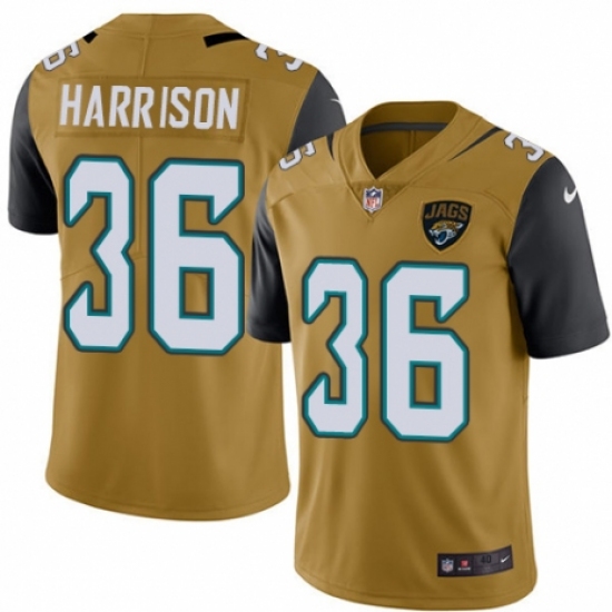 >Men's Nike Jacksonville Jaguars #36 Ronnie Harrison Limited Gold Rush Vapor Untouchable NFL Jersey