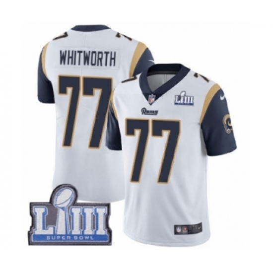 >Men's Nike Los Angeles Rams #77 Andrew Whitworth White Vapor Untouchable Limited Player Super Bowl LIII Bound NFL Jersey