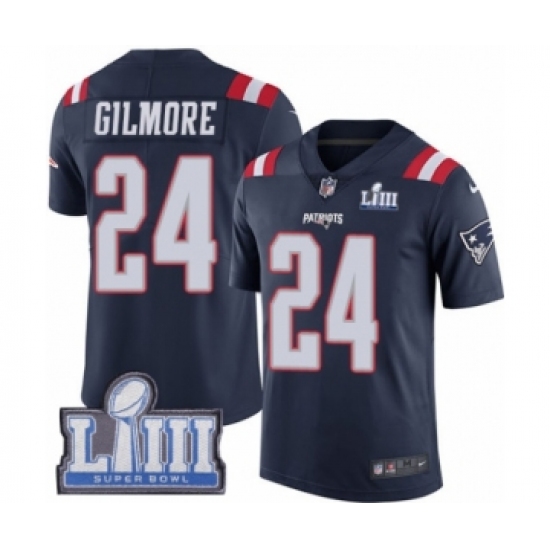 >Men's Nike New England Patriots #24 Stephon Gilmore Limited Navy Blue Rush Vapor Untouchable Super Bowl LIII Bound NFL Jersey