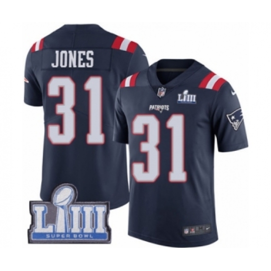 >Men's Nike New England Patriots #31 Jonathan Jones Limited Navy Blue Rush Vapor Untouchable Super Bowl LIII Bound NFL Jersey