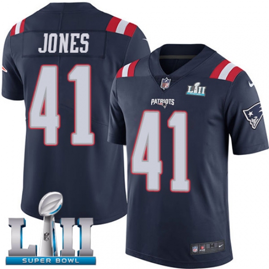 Men's Nike New England Patriots #41 Cyrus Jones Limited Navy Blue Rush Vapor Untouchable Super Bowl LII NFL Jersey
