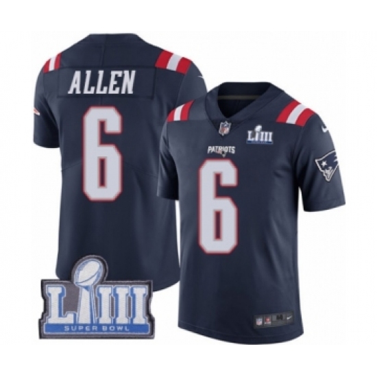 Men's Nike New England Patriots #6 Ryan Allen Limited Navy Blue Rush Vapor Untouchable Super Bowl LIII Bound NFL Jersey
