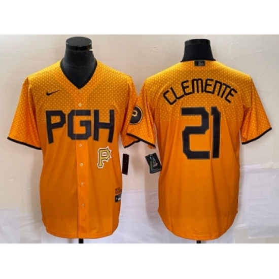 Men's Nike Pittsburgh Pirates #21 Roberto Clemente Gold 2023 City Connect Stitched Jersey 1