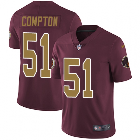 Men's Nike Washington Redskins #51 Will Compton Burgundy Red/Gold Number Alternate 80TH Anniversary Vapor Untouchable Limited Player NFL Jersey