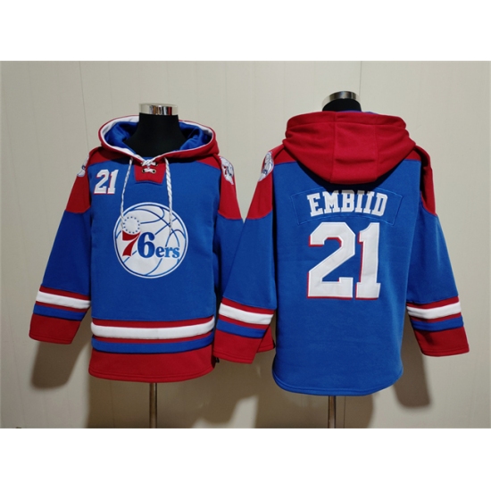 >Men's Philadelphia 76ers #21 Joel Embiid Royal Red Lace-Up Pullover Hoodie