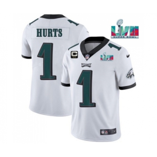 >Men's Philadelphia Eagles #1 Jalen Hurts White Super Bowl LVII And 2-star C Vapor Untouchable Limited Stitched Jersey
