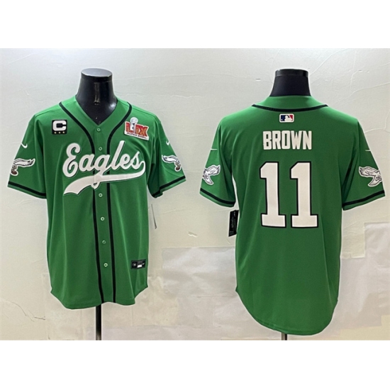>Men's Philadelphia Eagles #11 A.J. Brown Green 2025 Super Bowl LIX And 3-Star C Stitched Baseball Jersey
