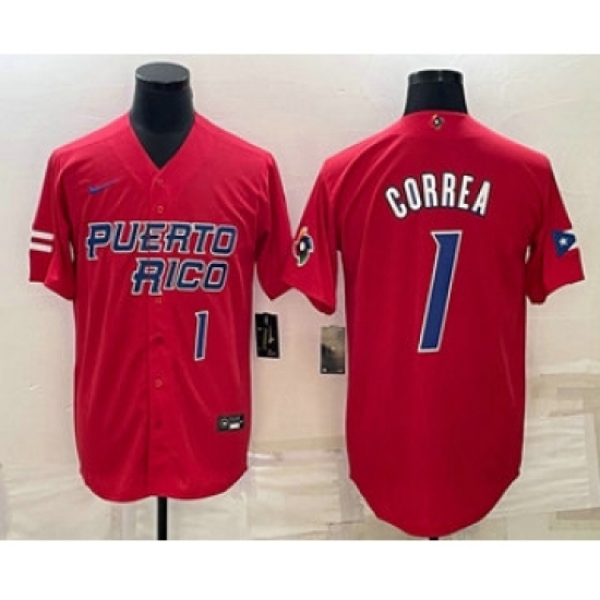 >Mens Puerto Rico Baseball #1 Carlos Correa Number 2023 Red World Baseball Classic Stitched Jersey