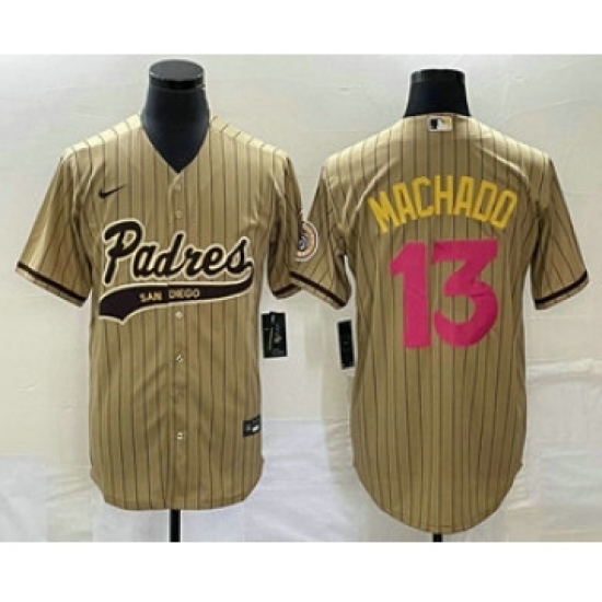 Men's San Diego Padres #13 Manny Machado Tan Pinstripe 2023 City Connect Cool Base Stitched Jersey