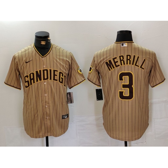 >Men's San Diego Padres #3 Jackson Merrill Tan NEW 2023 Cool Base Stitched Jersey