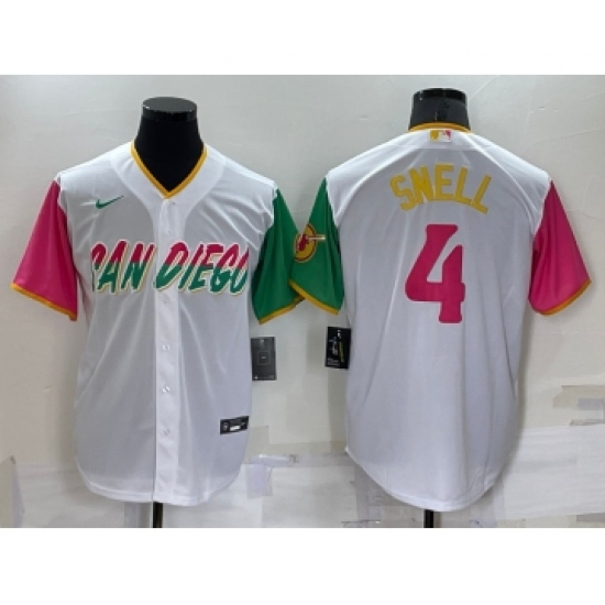>Men's San Diego Padres #4 Blake Snell White 2022 City Connect Cool Base Stitched Jersey