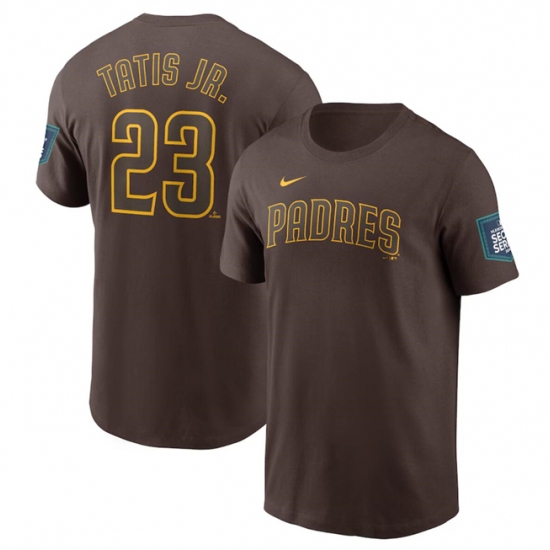 >Men's San Diego Padres Fernando #23 Tatis Jr. Brown 2024 World Tour Seoul Series Name & Number T-Shirt
