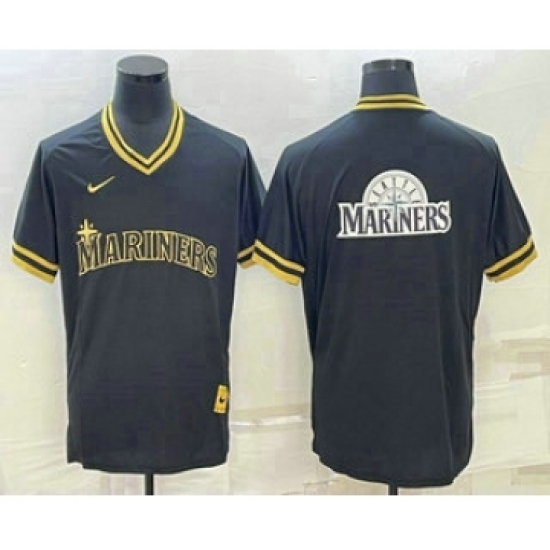 >Men's Seattle Mariners Big Logo Black Gold Nike Cooperstown Legend V Neck Jersey