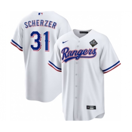 Men's Texas Rangers #31 Max Scherzer 2023 White World Series Stitched Baseball Jersey