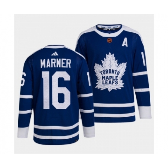 >Men's Toronto Maple Leafs Black #16 Mitch Marner Blue 2022 Reverse Retro Stitched Jersey