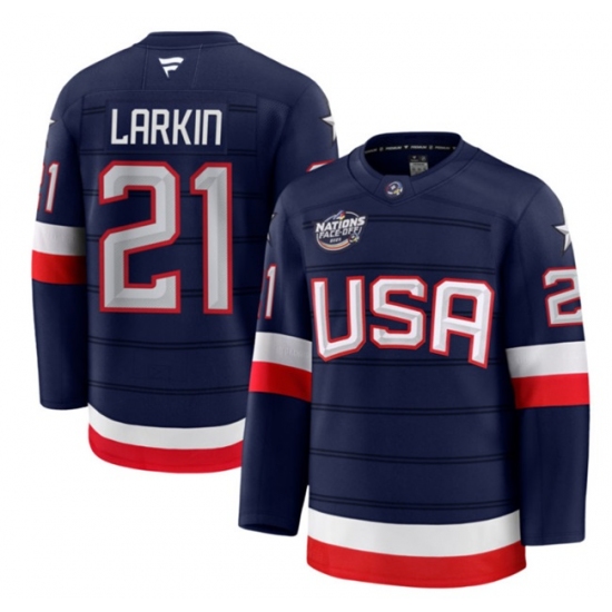 >Men's USA #21 Dylan Larkin Navy 2025 4 Nations Face-Off Stitched Jersey