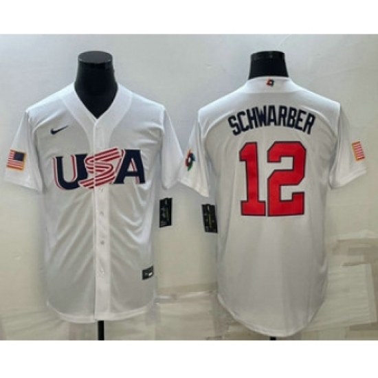 >Men's USA Baseball #12 Kyle Schwarber 2023 White World Baseball Classic Stitched Jersey